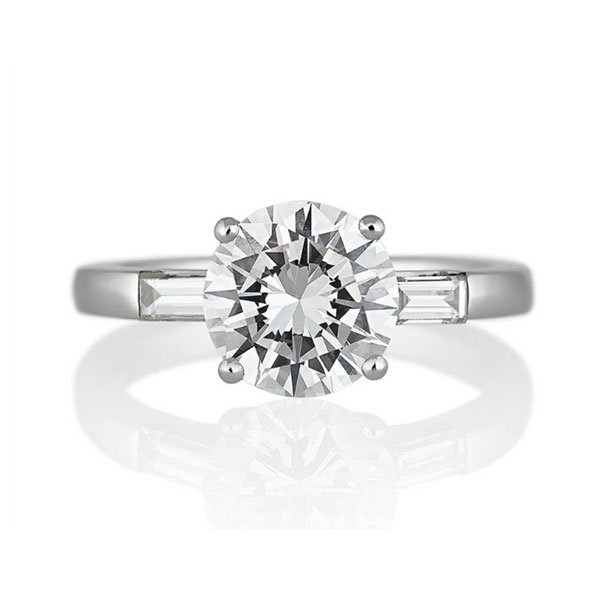 Anillo solitario realizado a mano en oro blanco con diamante central talla brillante, 2,07 cts, color G y pureza VS y diamantes laterales talla baguette, 0,40 cts.