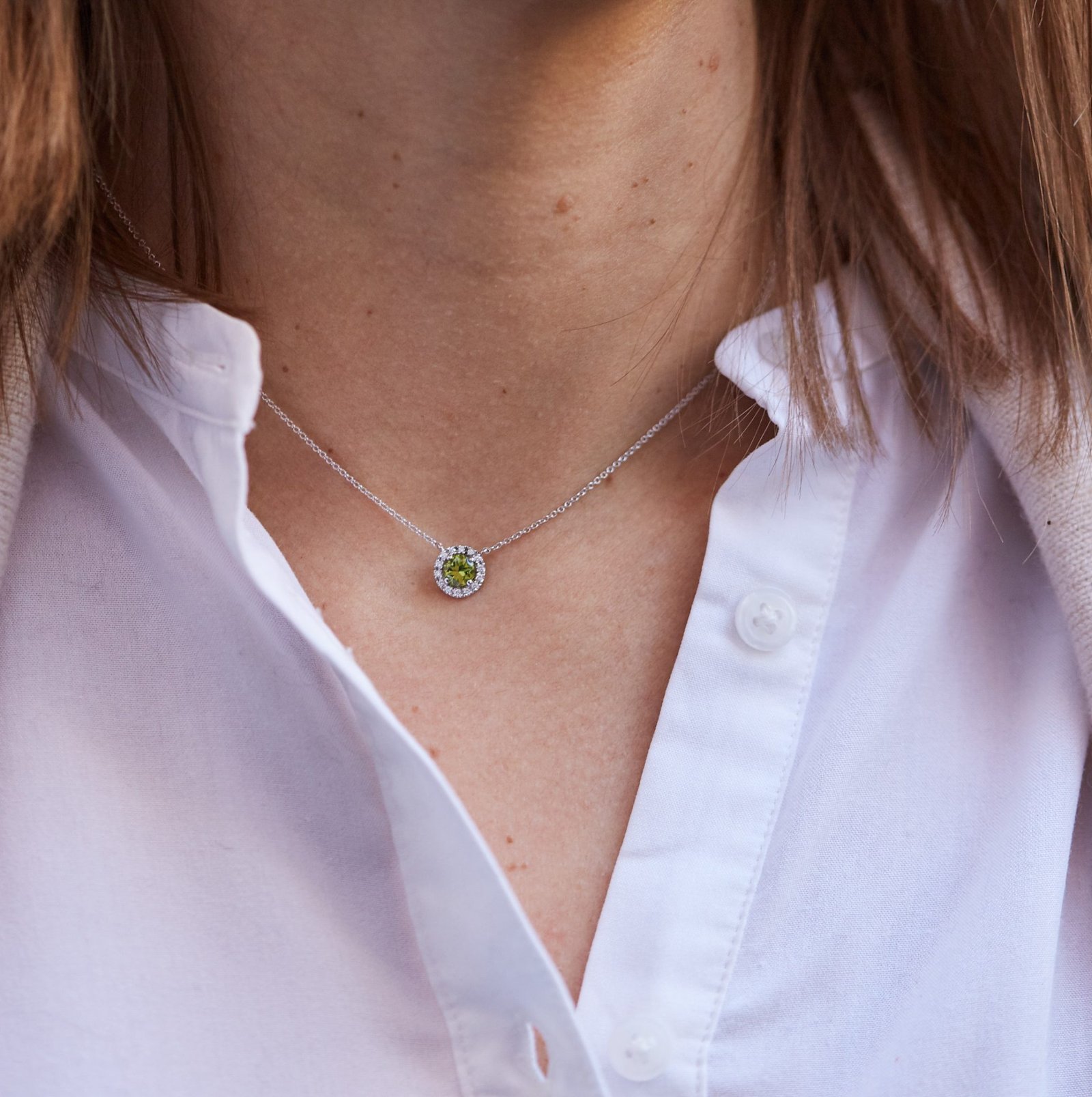 Colgante de la Colección "Basic" realizado en oro blanco, peridoto talla redonda y diamantes talla brillante engastados con grapas. Tamaño: 0,7 cm.