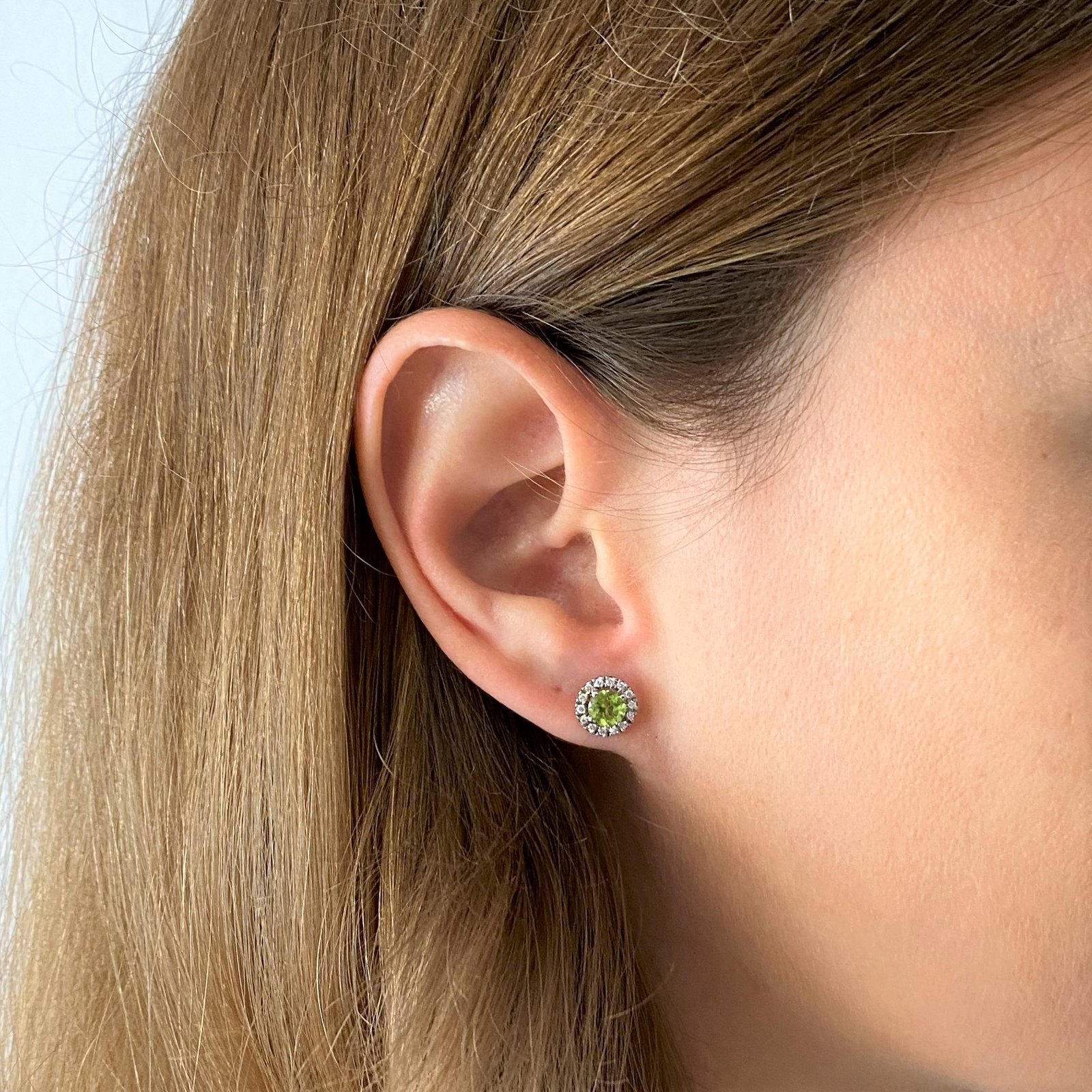 Pendientes de la colección "Basic" realizados en oro blanco, peridotos talla redonda y diamantes talla brillante engastados con grapas. Cierre a presión. Tamaño: 7,8 mm.