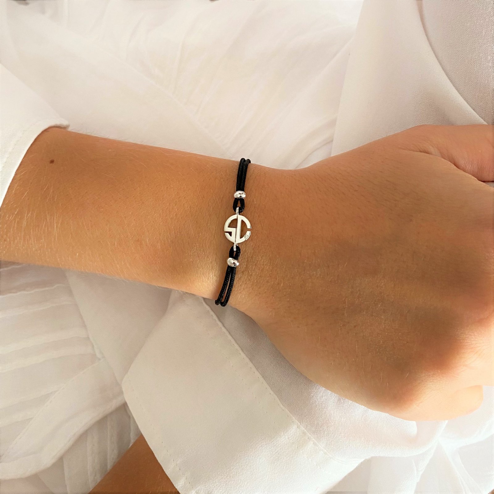 Pulsera en macramé con inicial SC en oro blanco y diamante